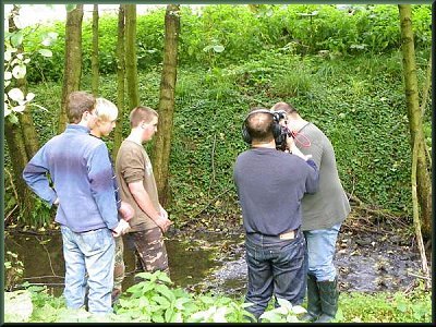 Marc von der Angelschule Bachfloh mit drei Junganglern, Sebastian, Maximilian und Marius, sowie Jörg Kiesow, von KiesowTV, beim Dreh eines Beitrages für eine Multimedia-DVD der Carl-Kraemer-Stiftung, die Bildungseinrichtungen für Umweltschulprojekte mit Jugendlichen zur Verfügung gestellt werden soll.